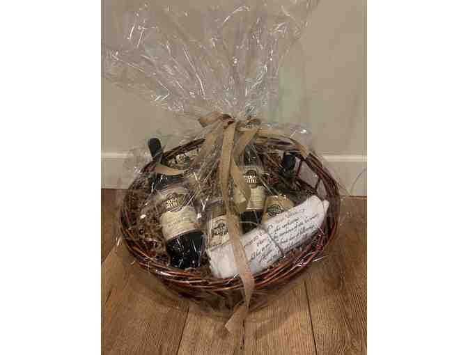 This basket includes a 2022 Sangiovese, a 2023 Burgundy, a custom wine towel, queen olives, an aioli, and a custom Bernardo Winery olive oil.