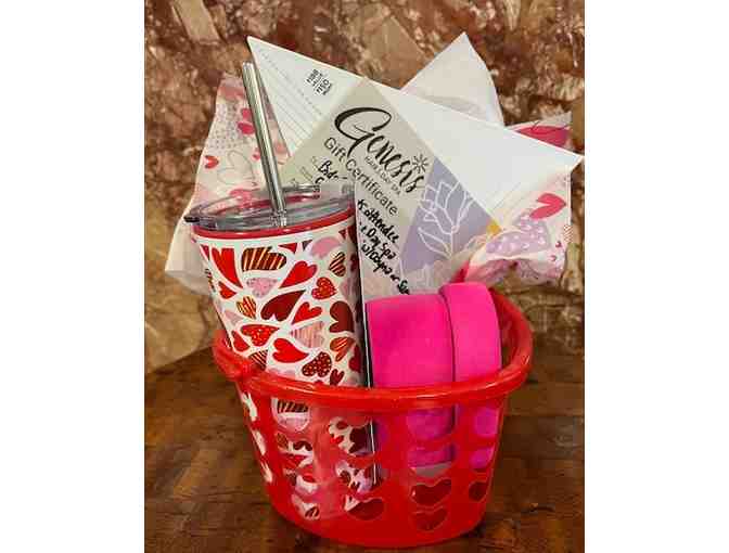 This heart-filled gift basket includes a gift certificate for a haircut & manicure with Dayna or Sam (expires 3/15/2026), Revitalash Double-Ended Volume Set, Heart Jewelry box, a candle, and a drink tumbler.