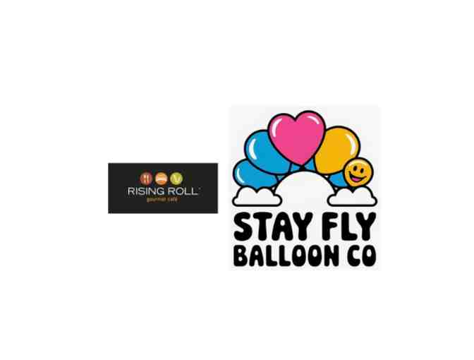 Package inlcludes one ballon arch from Northbrook Family Owned business, Stay Fly Balloons and $200 gift certificate to Rising Roll Gourmet Cafe.
