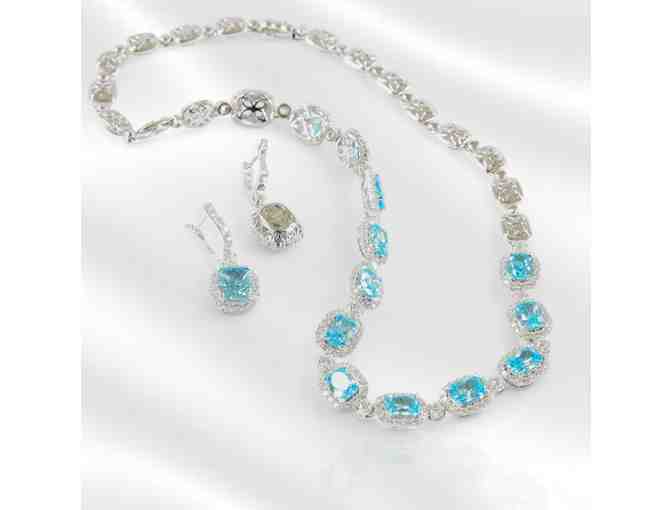Introducing the Splendor of Capri Collection, a breathtaking blend of timeless sophistication and the tranquil beauty of aquamarines. Crafted in premium 925 sterling silver and finished with a luxurious white gold overlay, this exquisite necklace and earrings set captures the enchanting allure of the crystal-clear blue waters of the Mediterranean coast of Capri, making it the ultimate statement of elegance and refinement. Perfect for a resort collection or vacation ensemble, this set embodies effortless luxury and relaxed sophistication.