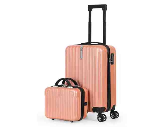 No need to check a bag with this rolling, hard cover, 2-piece travel set. Set includes a carry-on size suitcase with perosnal item sized bag in rose gold.