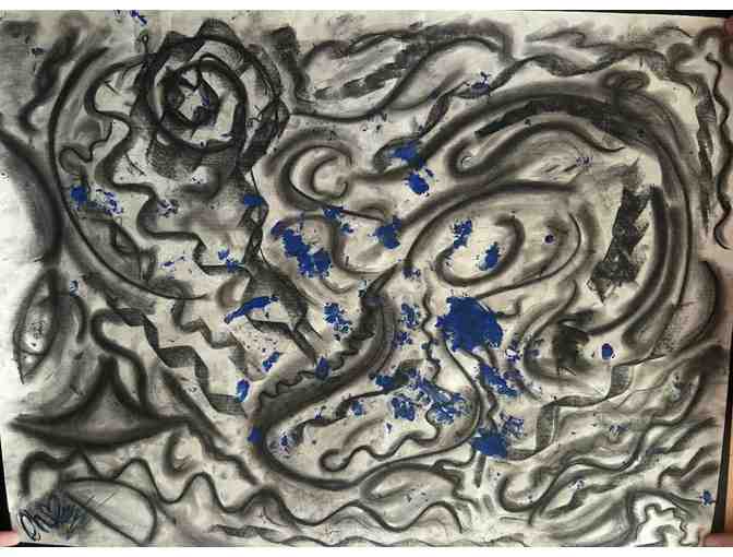 This large, original work of art is signed by the artist, Disney II Senior Chelsea Torres. This playful piece is representative of the artist’s relationship with her cat and showcases beautiful shading work and movement throughout. The cat’s footprints can be seen moving about the piece in acrylic blue paint. A special and unique piece for animal lovers and art lovers alike!
