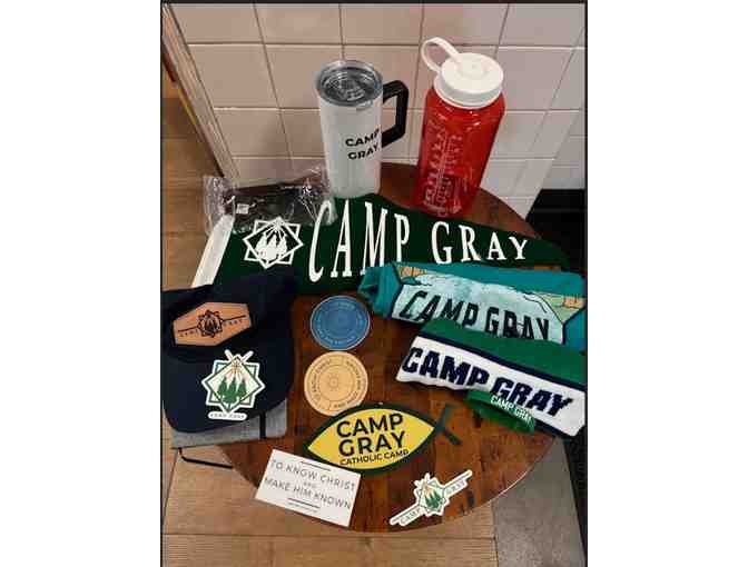 This basket is packed with all sorts of fun Camp Gray items for one lucky kid camper this summer! This basket contains a baseball cap, a water bottle, t-shirt, frisbee, sunglasses, bracelets, and a journal.