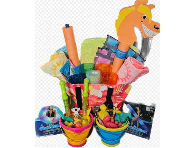 This basket is perfect for anyone looking forward to summer fun! It has all the things you need for a fun day at the pool. The basket includes a beach bag, towels, pool noodles, collapsible buckets, pool toys, inflatables, glasses, and much more.
