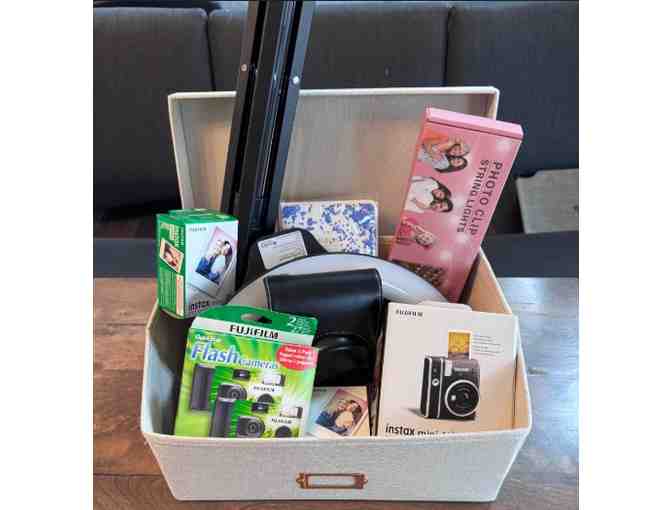 This basket includes Fujiifilm Instax Mini 40 Instant Camera in Vintage Black, Fujiifilm Value Pack (40 sheets), Vintage Style Carrying Case and Photo Album with 64 pockets. A 14' Selfie Ring with Light with 62" Tripod Stand, Phone Holder and Remote Control. Two Fujiifilm Quick Snap Flash Disposable Cameras and 17ft LED Fairy String Lights with Clear Clips all in a Decorative Photo Storage Box.