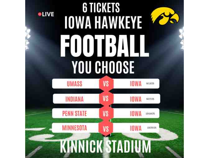 Calling all Hawkeye Fans! We have 6 tickets together available to cheer on the Hawkeye Football Team at Kinnick Stadium. Your choice of one of four games to attend.