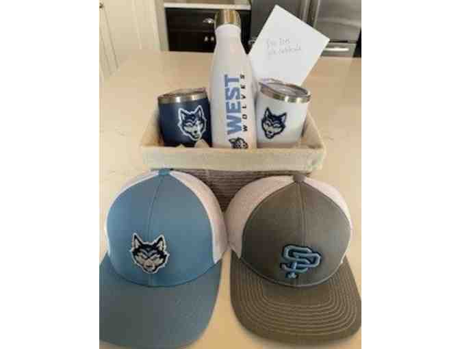 The SP-West basket includes two ball caps, water bottle, and two additional tumblers. It also includes a $100 gift certificate to shop at Elite Embroidery & Screen Printing to outfit yourselves in Wolves Gear!