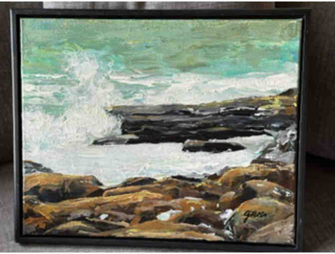 Beautiful painting of a seascape in Wells, Maine. This painting is acrylic on canvas, measures 20w x 16h and is in a black frame.