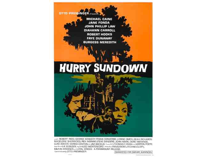 Hurry Sundown, the 1967 Otto Preminger post-WWII romantic drama starring Michael Caine, Jane Fonda, John Phillip Law, Diahann Carroll, Faye Dunaway, Burgess Meredith, George Kennedy, Rex Ingram, Jim Backus and Peter Goff.