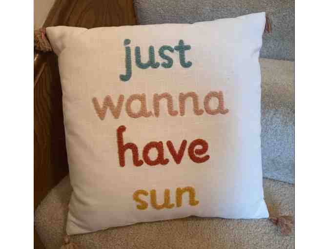 So, so fun, this “Just wanna have sun” toss pillow measures 16 in. x 16 in. the shell is 100% cotton, the filling 100% Polyester. Let the summer begin!!