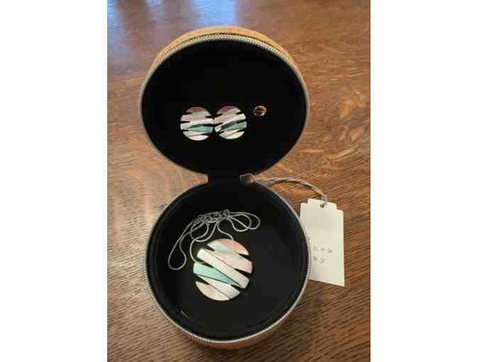 A Round Travel, zippered Jewelry organizer from A New Day - Dimensions appr. 1.5 Inches high x 3 Inches wide x 3 Inches deep. Perfect when you only need to pack a few items and short on suitcase space. Necklace with 16” chain with a 2” extension and matching earrings included.