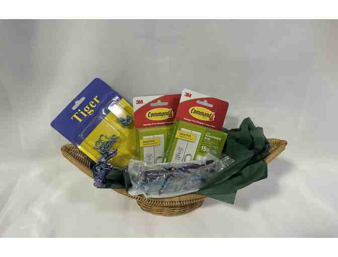 Purple floral household 6 in hammer/screwdriver inside. Purple rimmed safety glasses. 2 sets of command strips. Tiger eye hooks of various sizes.