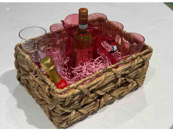 Have a good time with this fun basket which includes a bottle of white wine, 6 sparkly cups, a pitcher, and sparkling rose gummies.