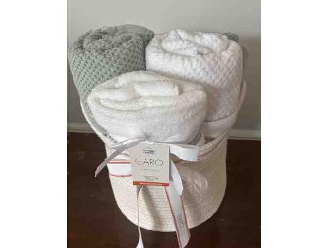 Caro Spa Collection: 2 hand towels and 4 jumbo waffle bath towels in a basket
