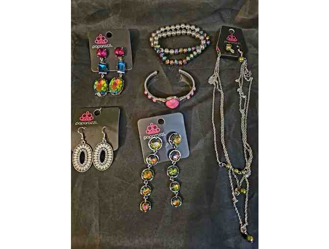 3 pairs of sparkly earrings, 3 bracelets, necklace and earring set, and one bag of dill pickle flamin hot cheetos (highly sought after expiration 5-25