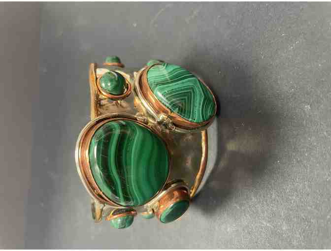 Gorgeous malachite cabachons in/on hammered silver (?) cuff. Line of copper outlines the cabs and main wrist piece. Approximately 8" around periphery. Slightly adjustable (with care).