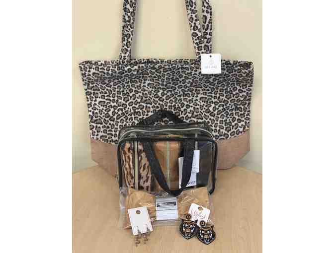 Love animal print or animals in general? Then this is the bundle for you! Includes a leopard print tote bag with zipper closure, a Nine West clear travel bags with 3 smaller travel bags inside and toiletry bottle, a Foot Palace weighted silk eye mask, gold snake earrings, and beaded tiger earrings.