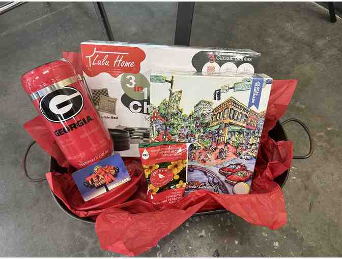 Basket includes a $50 gift card to Texas Roadhouse, UGA hummingbird feeder w/ feed mix, jumbo black and red checkers game, and a collectible downtown Athens puzzle.