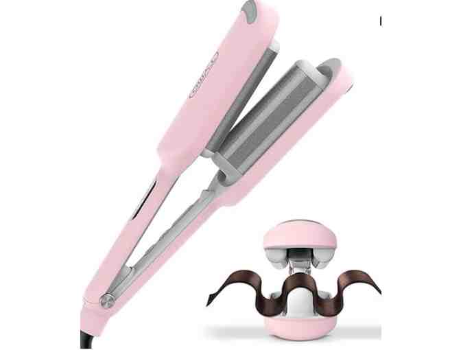 A pink, 1.25 inch curling iron of increased size results in beach waves that are larger and more luxuriant