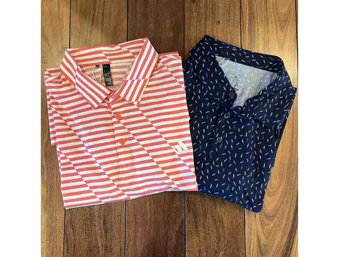 Two Rush Creek branded Adidas golf polos in Men's XL :