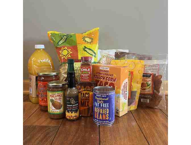 Enjoy a slection of Trader Joe's Taco Night items: - Elote Corn Chip Dippers - White Corn Tortilla Chips - Stone Ground Yellow Corn Taco Shells - Pineapple Salsa - Enchilada Sauce - Black beans - Refried beans - Garlic & Jalapeno Hot Sauce - Plantain Crisps - Chile Spiced Dried Mangoes & Pineapples - Taco Seasoning - Chlid Lime Seasoning Blend - Sweet Potato Habanero Hot Sauce - Mango Nectar Juice