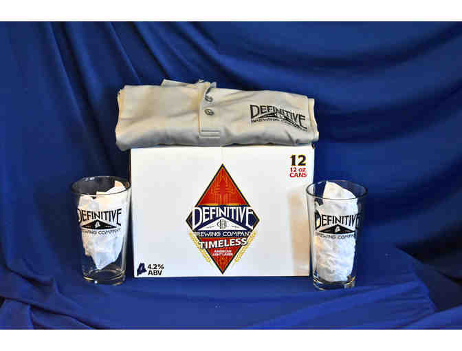 Package includes two pint glasses, 12 pack Timeless American Light Lager, size small polo shirt.