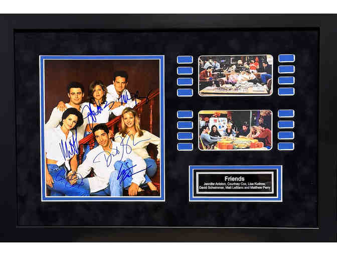 This item comes beautifully custom framed with double-layered, black suede and blue matting, elegant black museum quality frame, and silver-on-black engraved nameplate. Signed by: Jennifer Aniston, Courtney Cox, Lisa Kudrow, David Schwimmer, Matt LeBlanc & Matthew Perry (d. 10/28/2023)