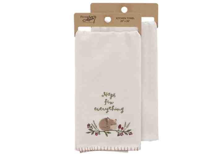 A cotton-linen blend kitchen towel from our Cottagecore Collection displaying a design of a fox sleeping above greenery with fun "Naps Fix Everything" sentiment. Design and sentiment are embroidered with complementing hemstitch on edge for added interest.