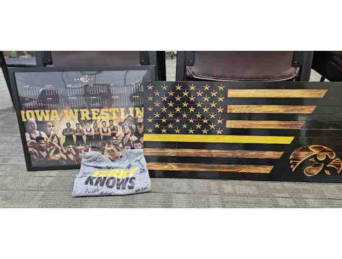 Show your Hawkeye Spirit with this basket full of Iowa fan gear. It includes a large wooden Hawkeye Flag, a poster of this year's wrestling team and an autographed t-shirt by all of the wrestlers including Fort Dodge's own Drake Ayala.