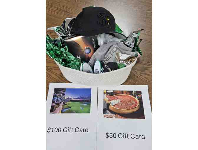 Enjoy a fun time with dinner out to Giordano's and some competition at Top Golf with this great golf basket.