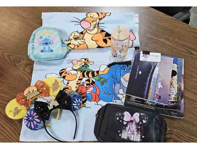 Here's a fun basket for the Disney fans in your life. Comes with 2 Winnie the Pooh microfiber towels, a small Stitch crossbody bag, a Disney castle zippered pouch, Pooh tumbler, and 2 Disney headbands plus information on how to book your own dream vacation to Walt Disney World.