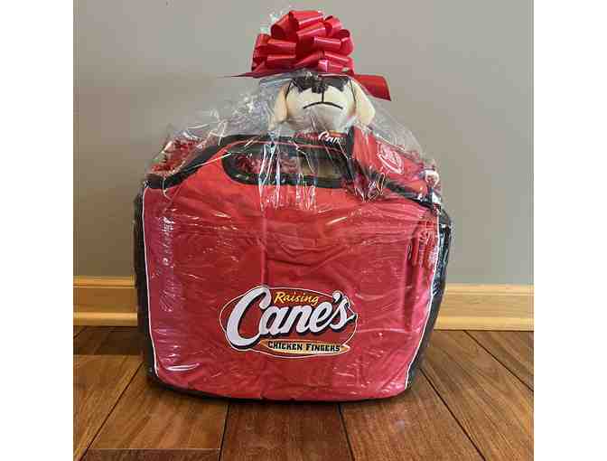 Raising Cane's Gift Basket Including Soft Side Insulated Cooler, 2 Magnets, Lip Balm, Stuffed Animal, Sticky Note Pad & 2 Pens, Can Koozie, and T Shirt Size Large.