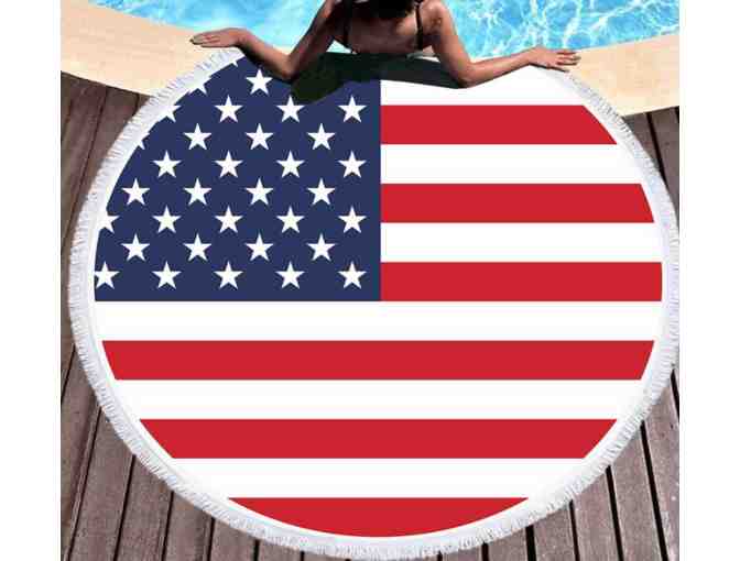 Why lay low when you can lounge in liberty? This Oversized Round Beach Towel is bursting with all-American pride, designed with bold stars and stripes to keep you cool while showing off your red, white and blue. From beach bashes to backyard BBQs, this towel-blanket hybrid is your ticket to cozy, star-spangled relaxation. Use it as a beach towel, picnic throw, or even a festive summer table cover. 59" in diameter.