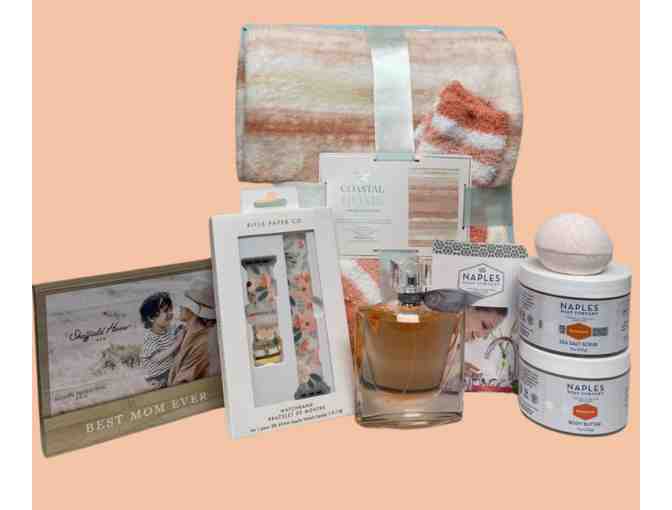 This basket includes: Lancôme La Vie Est Belle Perfume. A Massage Envy gift certificate for a 60 minute massage. Naples Soap Co. Sea Salt Scrub, Body Butter & Bath Bomb. Soft Blanket & Cozy Sock Combo. Rifle Paper Co. Apple Watch Band (Series 1–9/SE). A MOM picure frame.