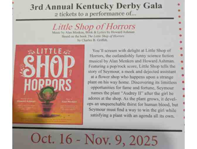You are bidding on a 2 tickets to a performance of Little Shop of Horrors being performed October 16 - November 09, 2025. Performance times 7:30 pm weeknights, 8 pm Friday and Saturday, 2 pm Matinees on Wednesday, Saturday and Sunday. (Available seating in sections B, C, D, or E)