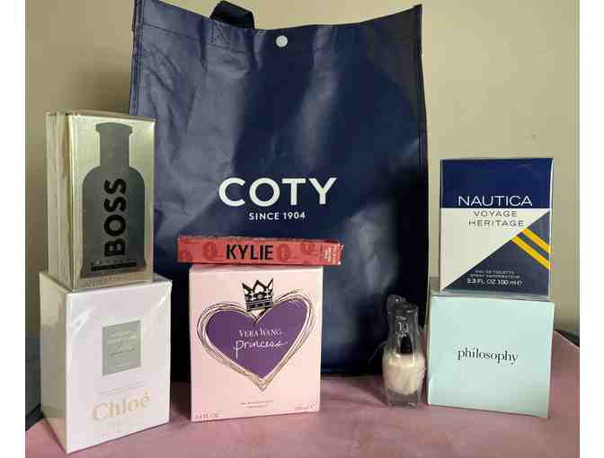 This collection for COTY, a global beauty products company, contains a variety of products from different brands: - 100ml VERA WANG Princess Parfum - 50ml BOSS Parfum - 100ml NAUTICA VOYAGE HERITAGE Parfum - 50 ml CHLOE ATELIER DES FLEURS IMMORTELLE Parfum - 240ml PHILOSOPHY Smooth-glow Moisturizer - KYLIE JENNER Lip Blush - COVER GIRL Plumper Gloss - SALLY HANSEN Miracle Gel Step 1 ETape First Glass