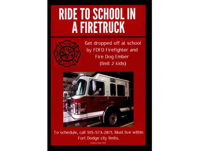 Make your child's dream come true with a ride to school for 2 students in a FD Fire truck. Date of ride is negotiable. Must live in the city limits of Fort Dodge.