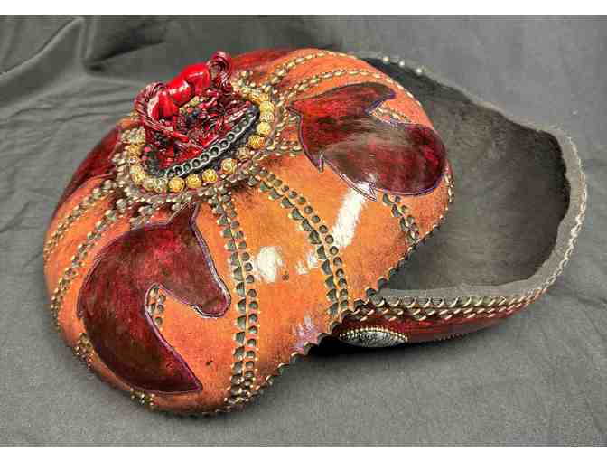 Beautful giant canteen gourd dyed, carved, and embellished by Master Gourd Artist, Joyce Campbell