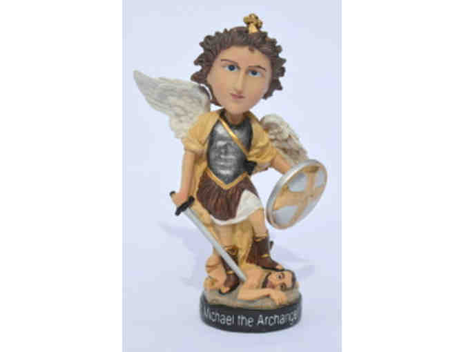 Lovingly created and donated by SaintBobbles.com, Saint Michael is part of a Box set of all six Inaugeral Saints in Limited Edition and numbered. Saint Michael the Archangel, Patron Saint of Soldiers, Police and Paramedics. Leader of the Army of God, ejecting Satan to hell! Saint Michael is hand crafted, hand painted, over 8 inches tall, made of high quality polyurethane.
