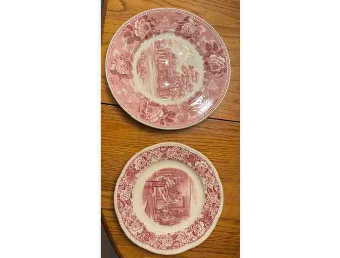 You are bidding on two vintage plates that will share your patriotism. One depicts Betsy Ross proudly displaying her beautiful flag for our country. The other is of the majestic Monticello in its pastoral setting. Given the coloring of each in brick red on cream colored plates with glossy finishes, they make a lovely pair for your wall or library shelf. Please check the pictures for information on the plates' condition and manufacture. The Betsy Ross plate was produced by the Homer Laughlin China Co in Philadephia, PA. Pictured are a few small chips on its back and some crazing. The Monticello plate was created by Wedgwood Etruria England per the bottom mark. It has minor flaws from the manufacturing process.