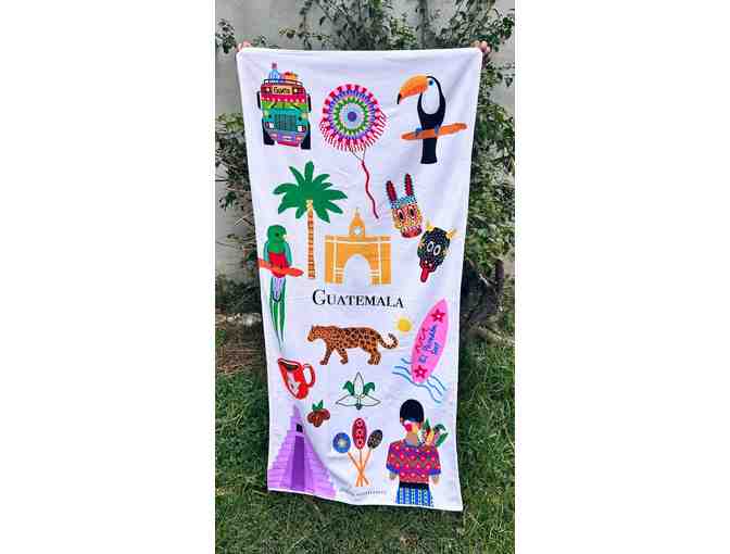 This eye-catching towel features colorful illustrations of iconic Guatemalan symbols — from volcanoes and tuk-tuks to coffee plants and colonial architecture.