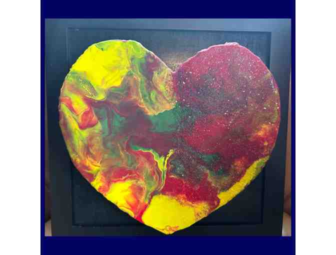 Heart painted with encaustic wax on ply-wood heart, mounted in a white frame.