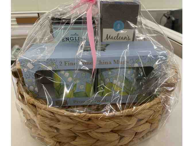 Unique gift basket includes Charbrew English Breakfast tea, biscuits from Macleans Bakery in Scotland, and 2 mugs