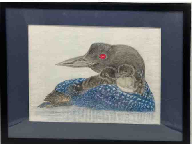 - Colored pencil image of loon with chicks by WBF rehabber Phyllis Tseng's mom Lu