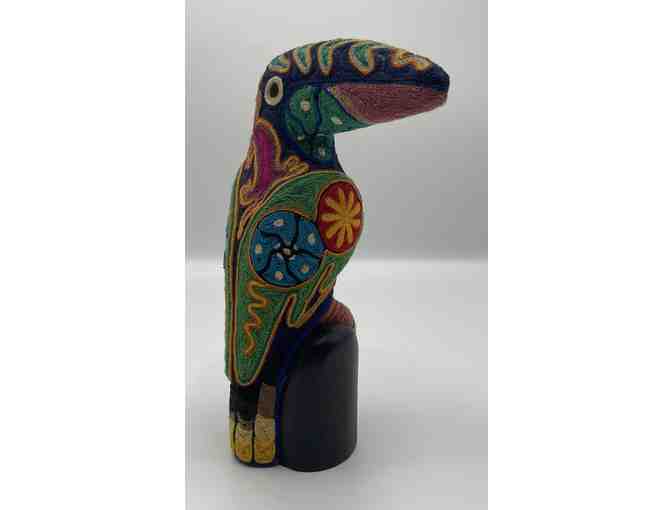 Fabulously intricate design work using fine colored yarn over beeswax covering a carved wooden toucan