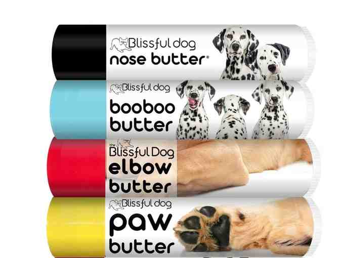 The Blissful Dog Nose to Toes Combo includes (1) .50oz tube of Nose Butter, (1) .50oz tube of Boo Boo Butter, (1) .50oz tube of Paw Butter, (1) .50oz tube of Elbow Butter, and a dog notepad.