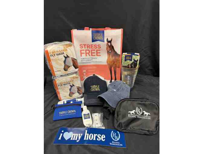 Includes: Two Horse sized Cashel Standard Fly Mask, Triple Crown Goodie Package a free bag coupon, Triple crown hat, Riding Warehouse zipper bag, Riding Warehouse hat, reuseable branded bag, Triple Crown feed cup and a number of small Triple Crown and Riding Warehouse goodies for horse and rider.