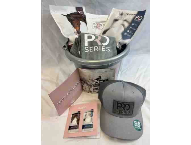 Gift bucket is filled with a sample bag of Pro Series Equine Engage - Cool Calorie Base and a sample bag of Pro Series Equine Achieve - Performance Base, two hand towels, a baseball cap, and information on the Pro Series products.