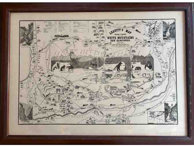 Original 1888 Leavitt's Map of the White Mountains. Combining folk art with a schematic tourist map, this unusual map views the White Mountains. In the center, the mountains were drawn in landscape format surrounded by curious vignettes including “Old Crawford Killing a Bear” and “Harry Crawford Killing a Lynx”. The map includes a railroad map and views of waterfalls, while symbolic images of hotels, stage coaches, and trains alert readers to the region’s tourist amenities. Leavitt, a laborer, mountain guide, and self-taught mapmaker, created this pictorial map.