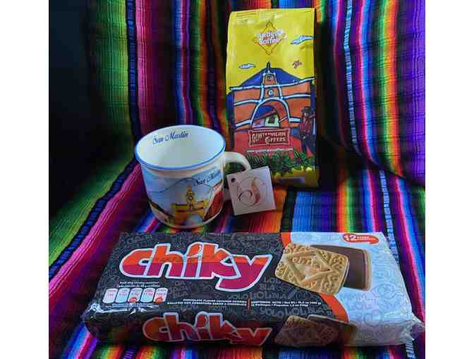 included in this auction item is a ceramic "San Martin" coffee mug, a 1 pund bag of guatemalan coffee and a package of 12 individually wrapped servings of Chiky guatemalan cookies.
